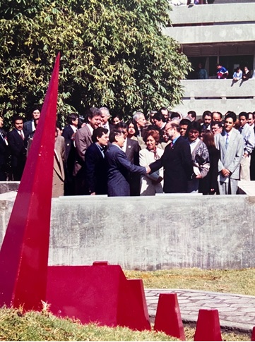En el Campus Iztacala de la UNAM, durante la develación del Reloj Solar, 1994, con el rector el Dr. José Sarukhán Kermez, y la Mtra. Arlette López Trujillo directora, saludando al rector mi padre Andrés Peraza, atrás de él, yo.